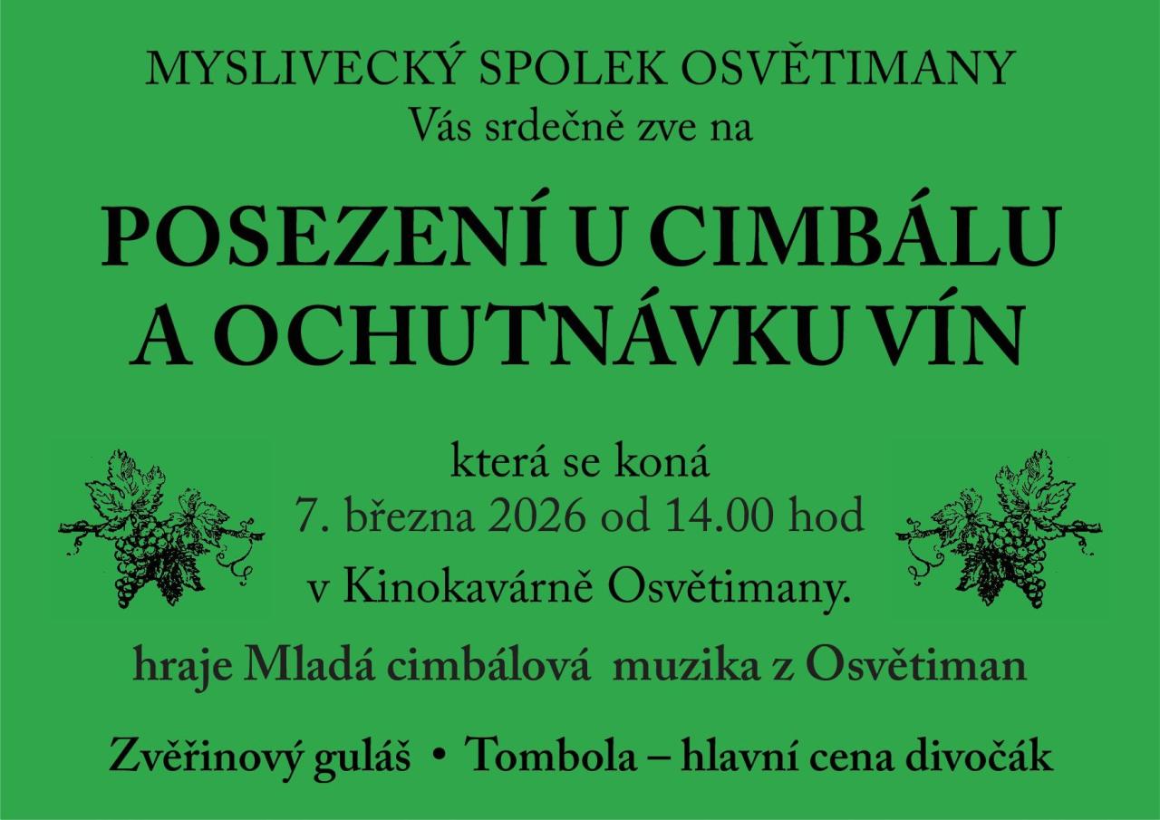 Myslivecký spolek Osvětimany vás srdečně zve na posezení u cimbálu a ochutnávku vín. Akce se koná 7. března 2026 od 14:00 hodin v Kinokavárně Osvětimany. O hudební doprovod se postará Mladá cimbálová muzika z Osvětiman, která vám nabídne příjemné zážitky. Kromě cimbálové muziky si budete moci vychutnat také zvěřinový guláš. Nezapomeňte se zúčastnit tomboly, kde je hlavní cenou divočák.